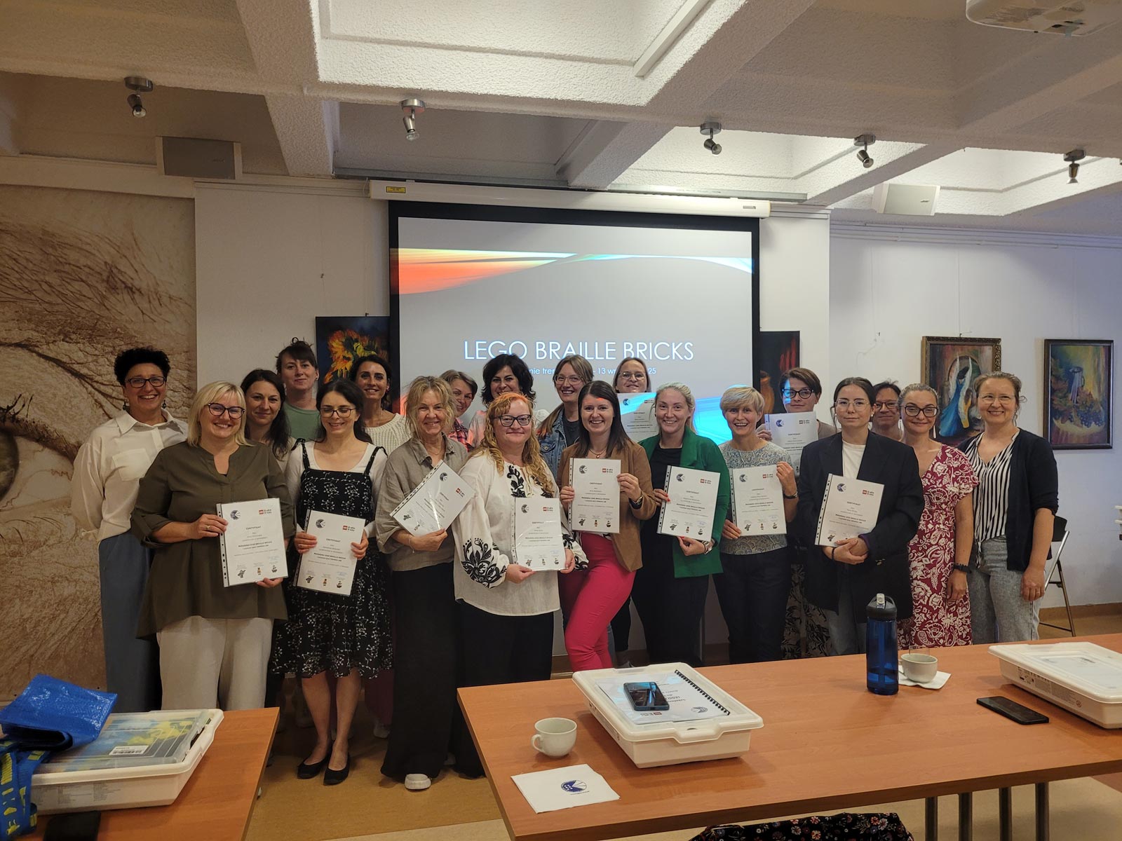 Podczas kilkugodzinnych warsztatów uczestnicy mogli doświadczyć na sobie radości z nauki poprzez zabawę, poznając metodykę LEGO BRAILLE BRICKS. Wszyscy byli bardzo zaangażowani podczas zajęć i otrzymali certyfikaty trenerów LBB.