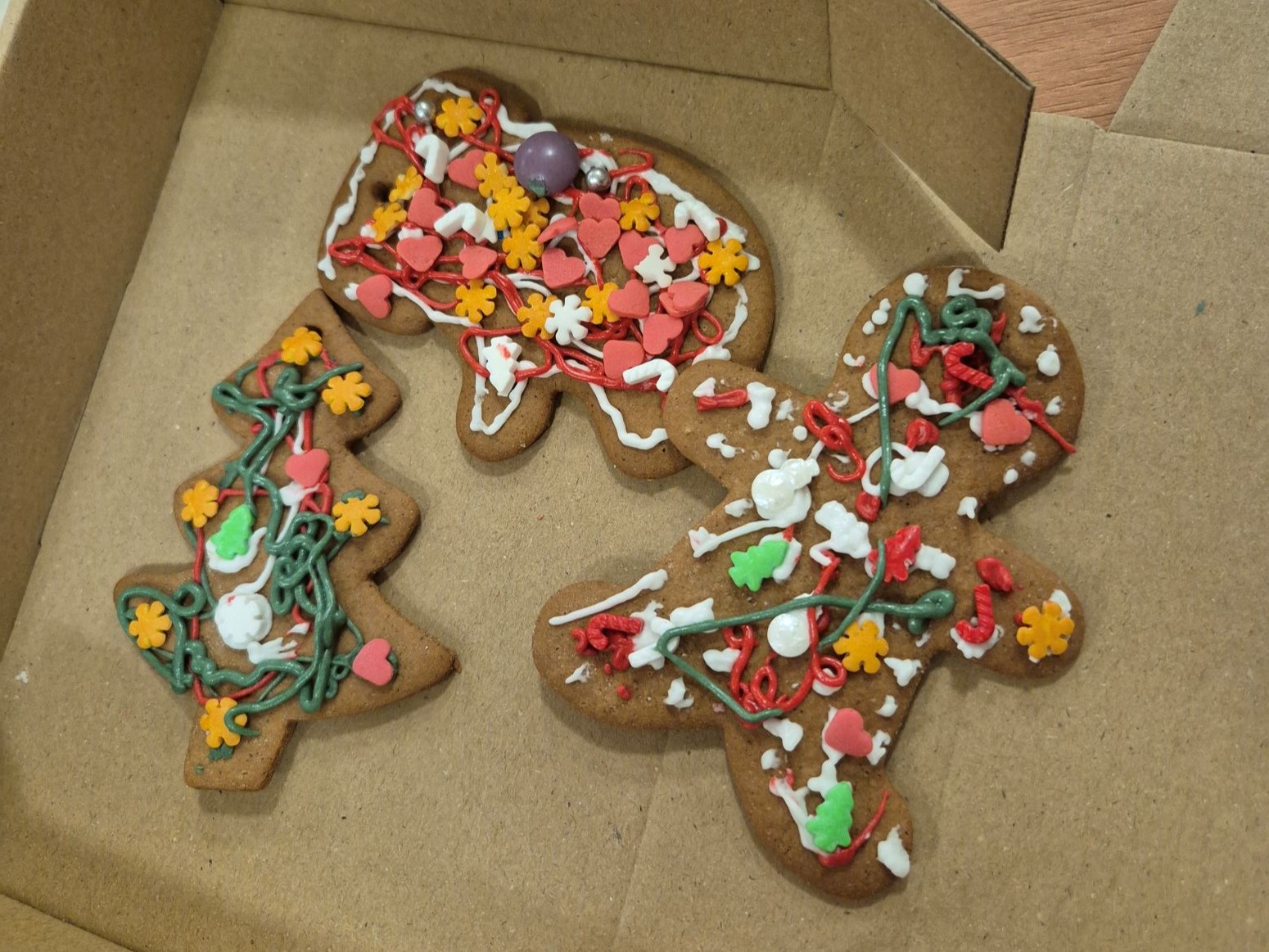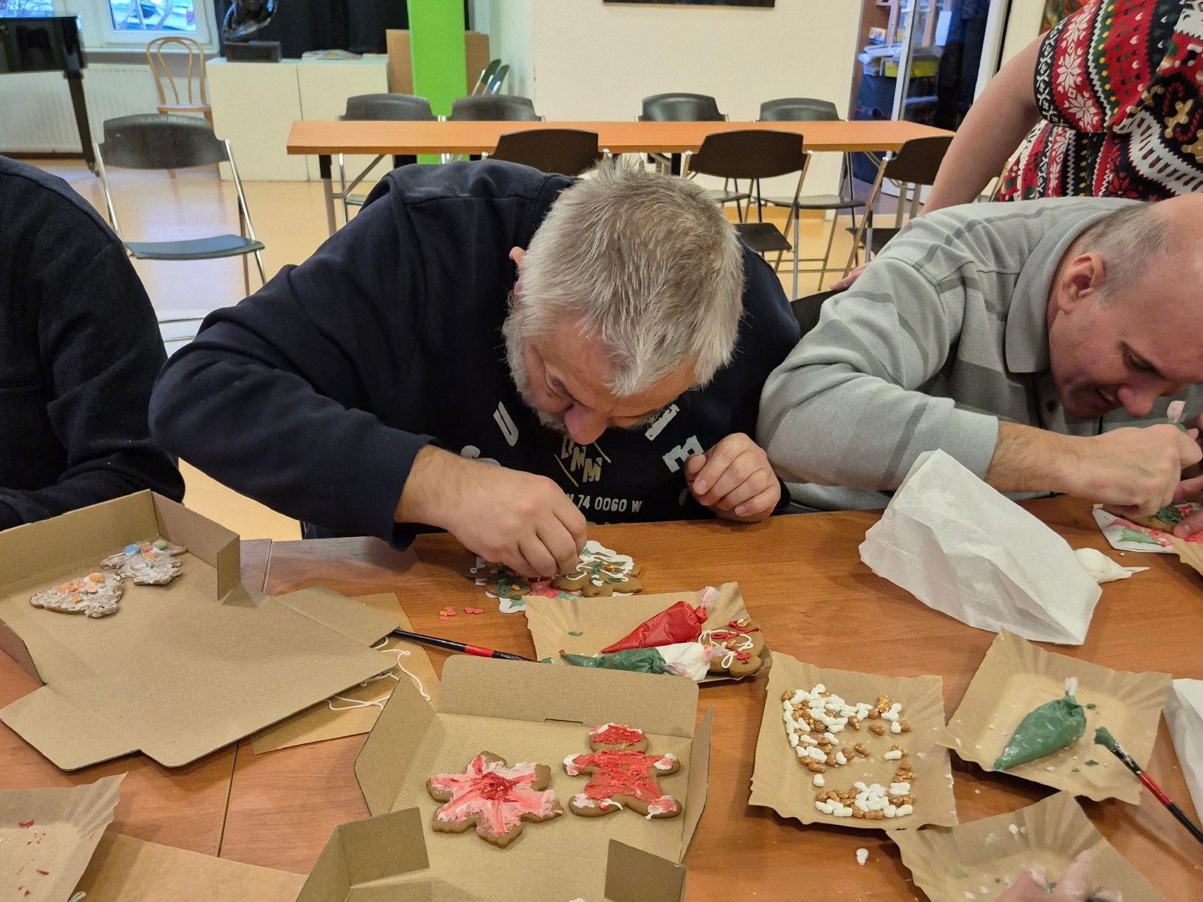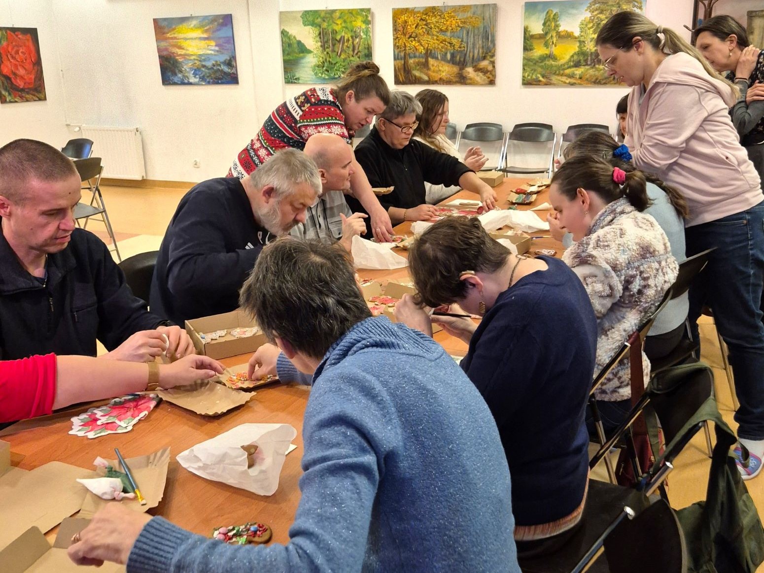 Po prelekcji przystąpiliśmy do pracy. Każdy z uczestników otrzymał pierniczki, kolorowe lukry i serwetki. Rozpoczęło się dekorowanie. Dało się zauważyć duże zaangażowanie uczestników – cukierników. Każdy piernik był inny, ozdobiony radością i miłością. Zabawa była doskonała.